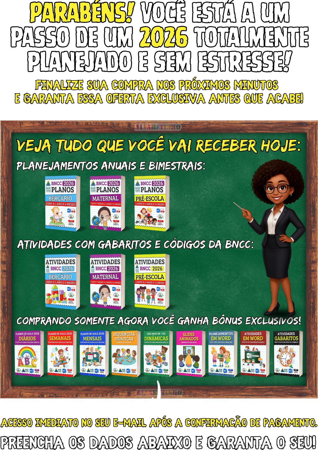 Adicione +900 Novos Planos Diários Bimestrais, contemplando TODOS OS CAMPOS DE EXPERIÊNCIA, são temas fundamentais para o ensino em sala de aula, com metodologias ativas para entregar o melhor material possível. 🎁 GANHE BÔNUS EXCLUSIVOS: 1️⃣ TODOS OS PLANOS DIÁRIOS EM WORD 2️⃣ +300 PLANOS SEMANAIS 3️⃣ +150 PLANOS MENSAIS 😱 DESCONTO IMPERDÍVEL, APENAS AGORA!