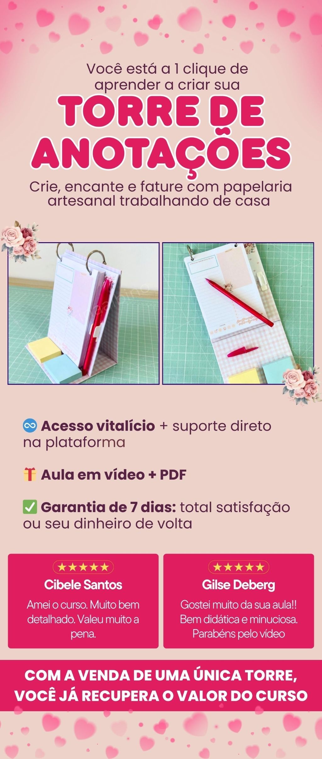 **AUMENTE SUA RENDA** Aprenda a criar o caderno mais vendido do meu ateliê. Passo a passo completo, com artes inclusas! Produção SEM usar ENCADERNADORA ou ENCADERNADORA ou MAQUINÁRIOS. Dois tamanhos: A4 e A5 + 2 Projetos BÔNUS.