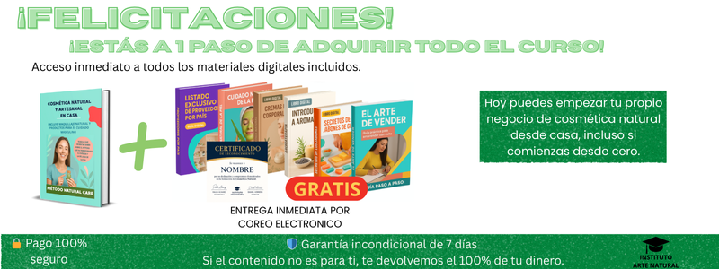 Accede a una colección completa con todos mis eBooks: texturas perfectas, shampoo natural, cremas y protectores naturales, y la guía esencial de conservantes. Todo lo que necesitas para formular con seguridad, calidad y resultados profesionales en casa.