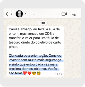 Somos Thyago e Carol, educadores financeiros e especialistas em investimentos (CEA). Investidores há mais de 7 anos, já ajudamos mais de 800 mulheres a darem os primeiros passos nos investimentos, retirando mais de R$ 12 milhões da poupança e da previdência privada com uma metodologia simples e prática.