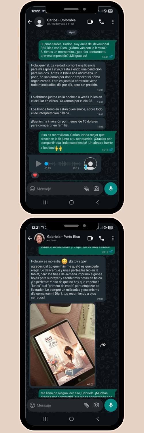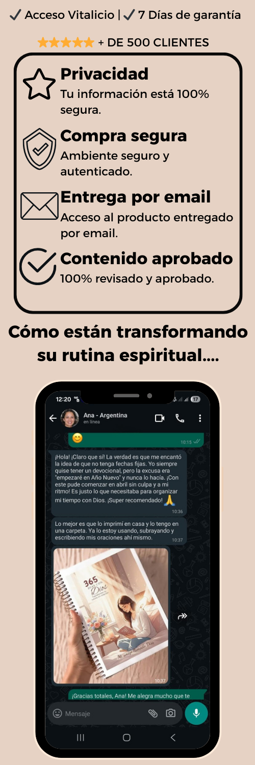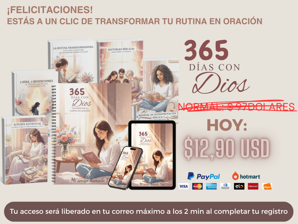 ¡Lleva tu transformación espiritual al siguiente nivel! En lugar de solo el devocional, llévate el **KIT COMPLETO** que cubre cada área de tu vida con Dios: • Tu intimidad creativa (Diario Bíblico) • Tu disciplina espiritual (Guía de Ayuno) • Tu matrimonio (Desafío en Pareja) • Tu hogar (Guía Familiar) Comienza con tu devocional diario, desarrolla tu intimidad divina a través del journaling, aprende el ayuno con sabiduría, y lleva esta bendición a tu matrimonio y hogar. ¡Una jornada de fe total