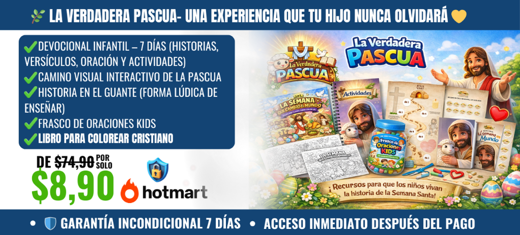 Transforma la Pascua en una experiencia divertida y con propósito. Incluye pistas listas para imprimir, tarjetas bíblicas y guía paso a paso para que los niños sigan el recorrido hasta el “tesoro final” — recordando que Jesús vive.