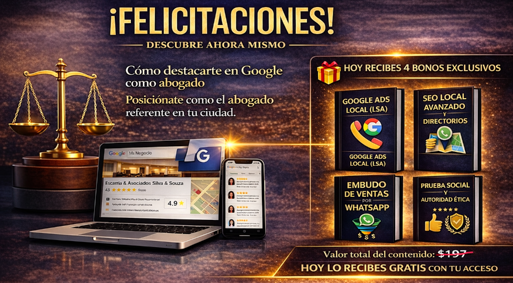 Acceso inmediato para posicionar tu despacho en Google y atraer clientes todos los días + bonos exclusivos incluidos.
