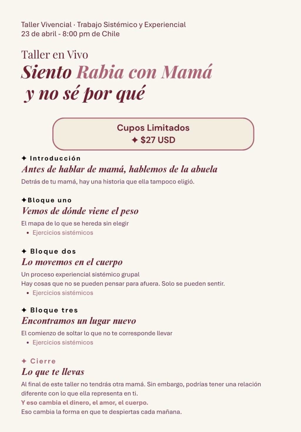 Accede a la grabación completa del taller “Siento rabia con mamá… y no sé por qué”, para que puedas verlo a tu ritmo y volver a él cada vez que lo necesites. En este taller comprenderás el origen de la rabia hacia tu mamá desde una mirada sistémica, y cómo esta emoción puede estar influyendo en tu vida actual: en tus relaciones, en tu bienestar emocional y en tu forma de vincularte con el dinero.