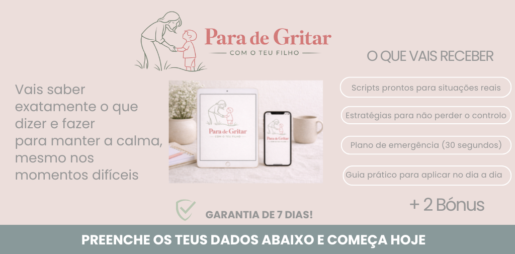 Descobre exatamente o que fazer depois de gritares para reparar a situação com o teu filho, sem culpa e sem piorar o momento. Mesmo que sintas que “já estragaste tudo”, ainda vais a tempo de recuperar a ligação. Clica em "Adicionar Item" Para Incluíres na Tua Compra.
