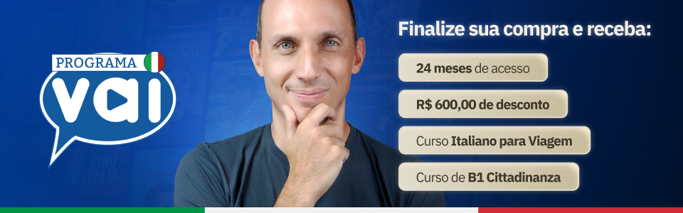 Com o Programa VAI 4.0, você aprende italiano de forma dinâmica e imersiva, com conteúdos autênticos analisados por 	um nativo, prática constante nos exercícios e laboratórios e um contato real com a língua e cultura italianas. 🚀