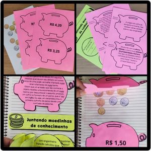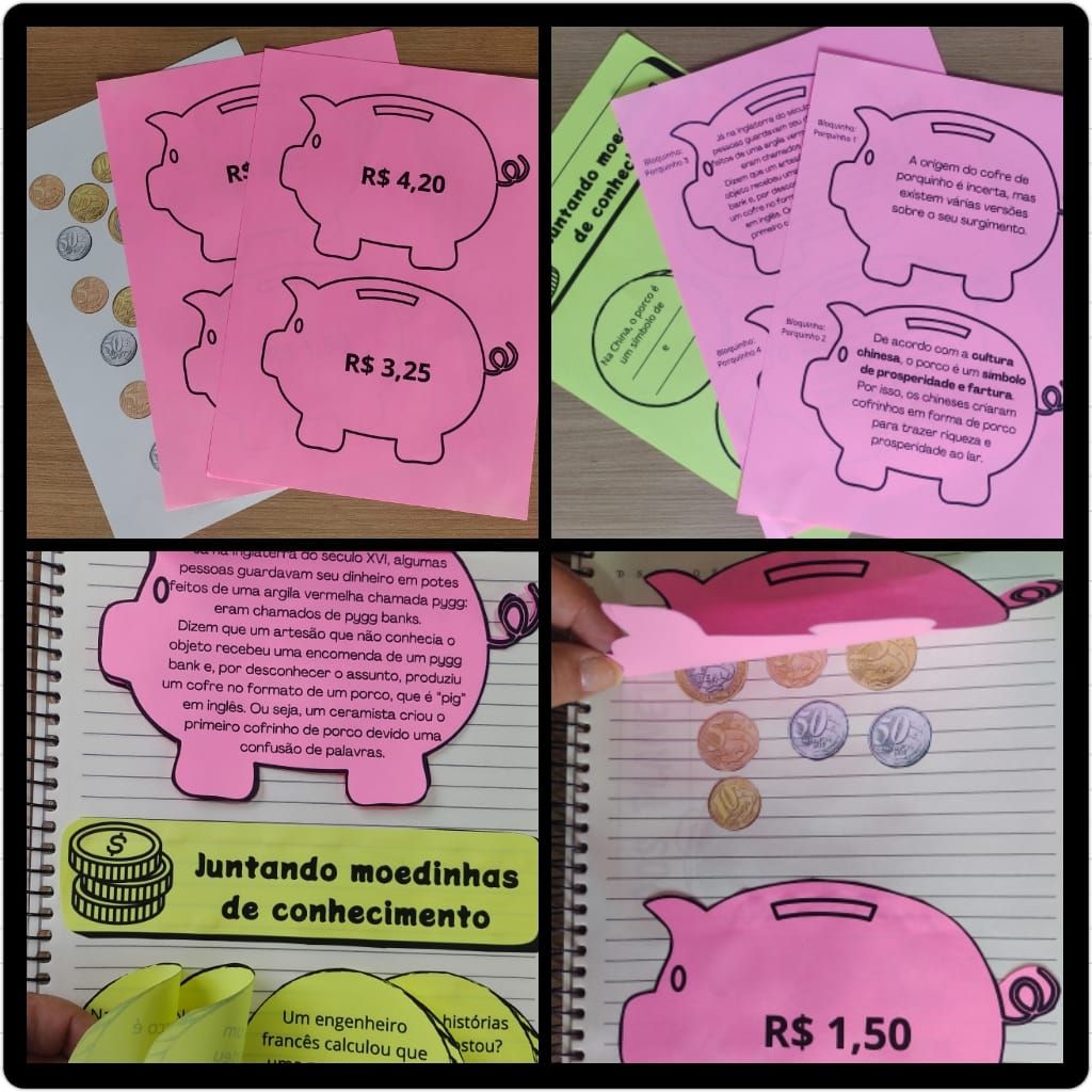 Na parte de Língua Portuguesa, os alunos irão conhecer a curiosa história do cofrinho de porquinho, símbolo tradicional da economia doméstica. A leitura de pequenos textos será acompanhada das nossas moedinhas de compreensão, que tornam a interpretação mais dinâmica e desafiadora.