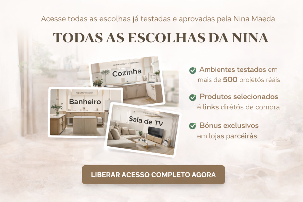 💡 Complete sua transformação com iluminação profissional Você já tem todas as Escolhas da Nina. Agora aprenda como iluminar corretamente cada ambiente para criar conforto, elegância e aconchego. ✔ Tipos de luz para cada espaço ✔ Temperatura de cor ideal ✔ Posicionamento correto de luminárias ✔ Evite erros que arruínam a decoração 👉 Adicionar ao meu pedido