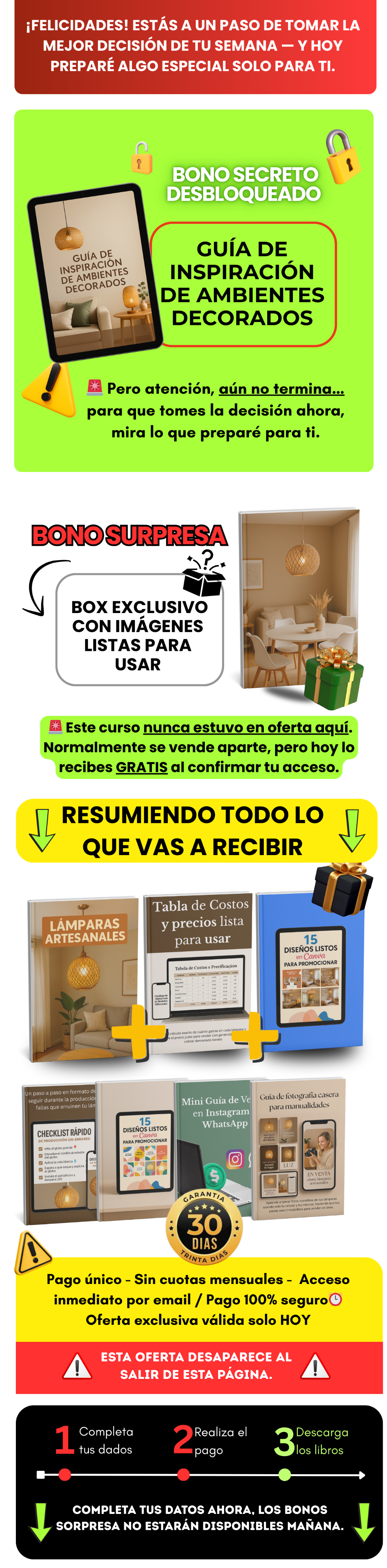 Combo 3 en 1 Artesanal: todos los productos anteriores Disfruta de un 41% de descuento HOY y recibe 3 guías premium para acelerar tus ventas y la creación de tu iluminación artesanal. ⚠️ Solo disponible en esta caja; no volverás a ver este precio.
