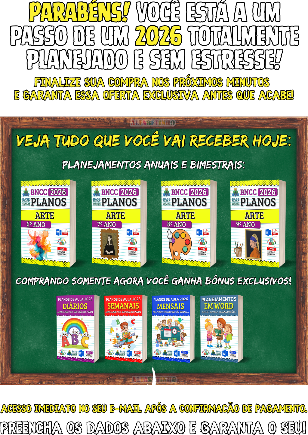 400 Atividades, todas organizadas por Ano e Bimestre, de acordo com a BNCC 2026. perfeitas para uso imediato. 🎁 GANHE BÔNUS EXCLUSIVOS: 1️⃣ ATIVIDADES EM WORD 2️⃣ GABARITOS DAS ATIVIDADES 3️⃣ 32 PLANOS DIÁRIOS 4️⃣ 24 PLANOS SEMANAIS 5️⃣ 16 PLANOS MENSAIS 😱 DESCONTO IMPERDÍVEL, APENAS AGORA!