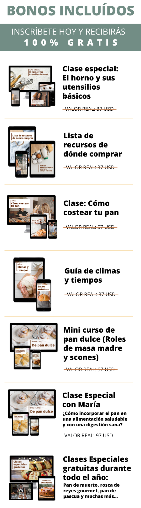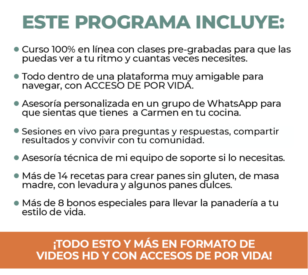 Incluye panes artesanales con recetas especiales elaboradas por mi mamá para que comer pan no te inflame y disfrutes en familia en estas fiestas. Desde Hogaza de masa madre de centeno, Pan alemán de frutos secos, Trenza de dátil y nuez, Rosca con salsa de frambuesa y más…