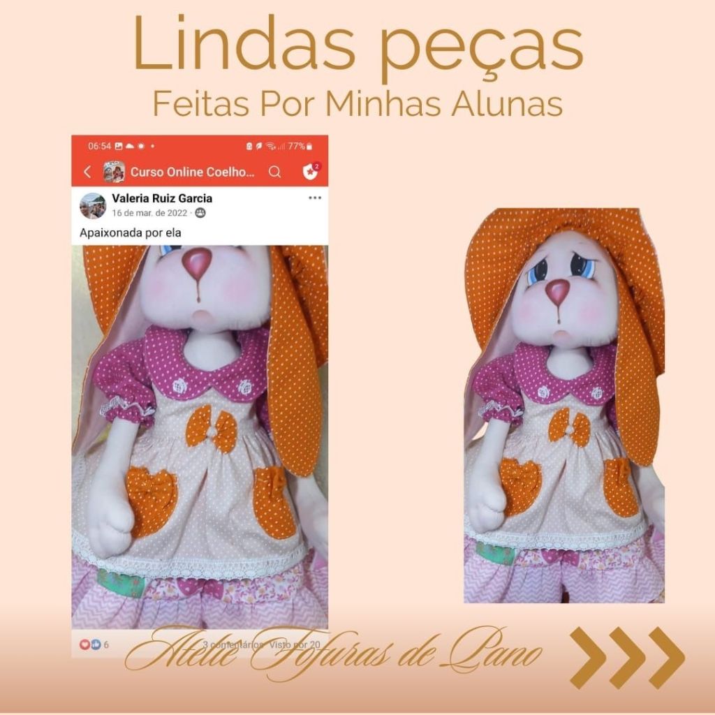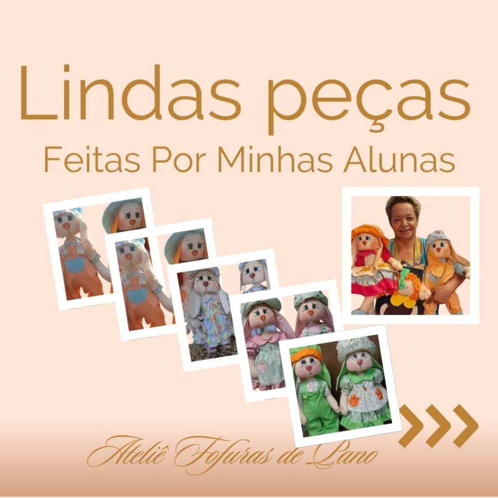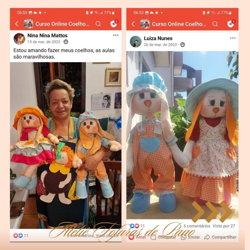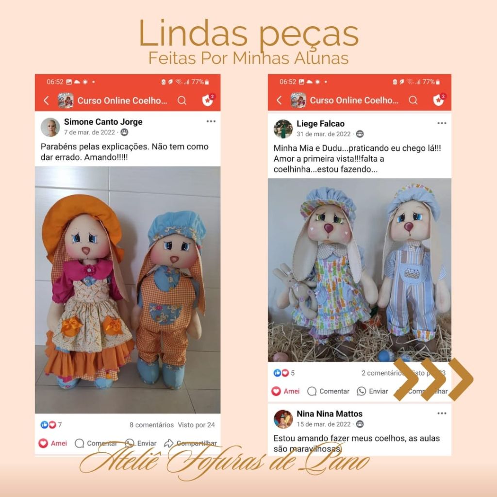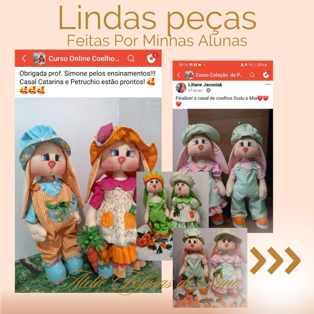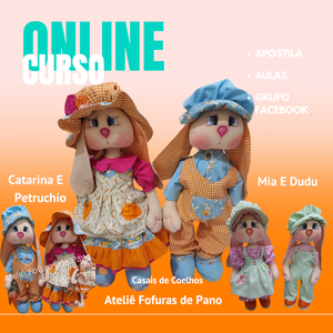 Com o nosso curso online e vitalício, você aprenderá a confeccionar dois casais de coelhos (um grande e um médio), com aulas passo a passo e moldes em PDF super detalhados.
