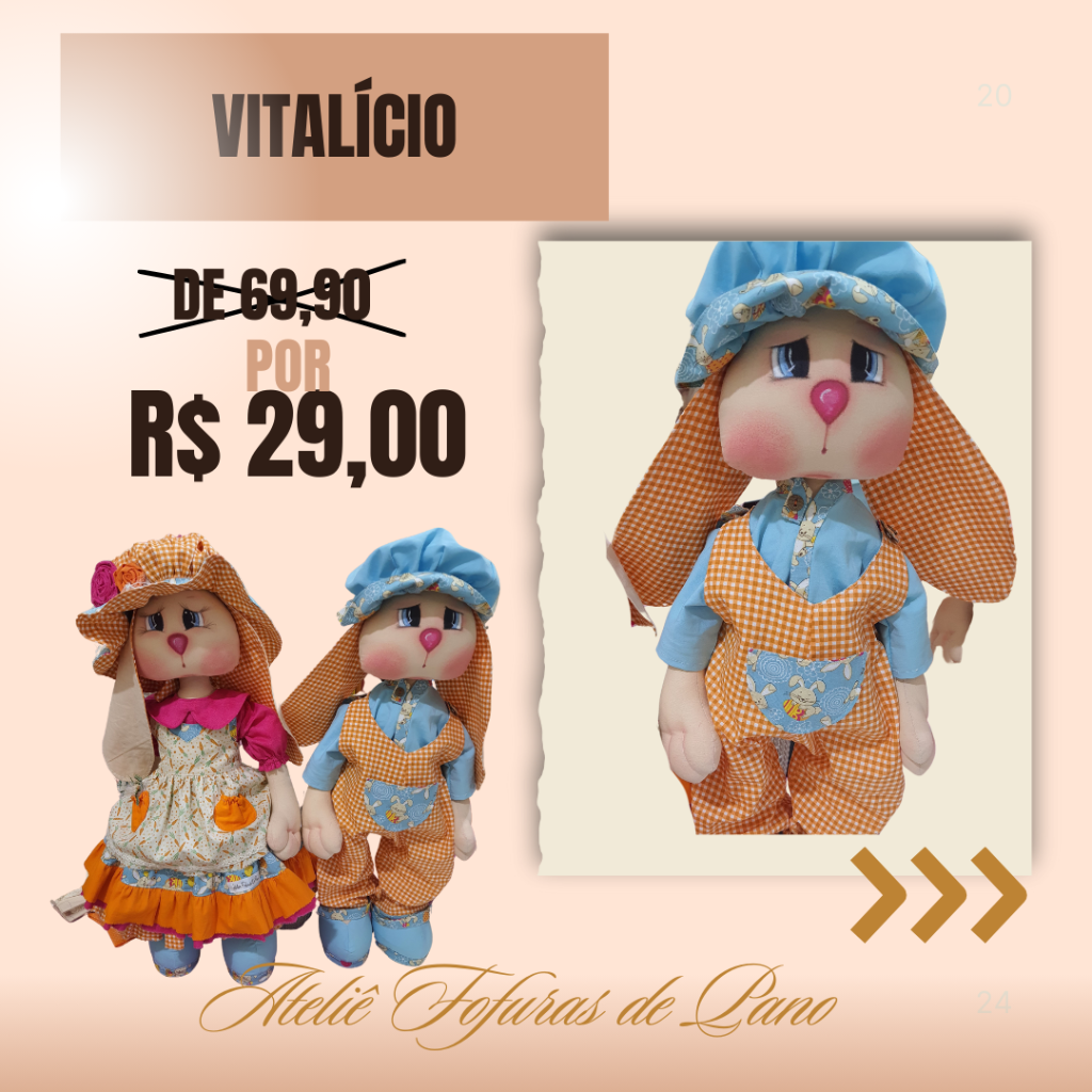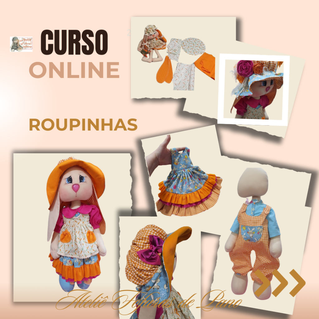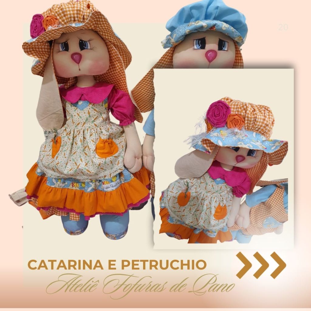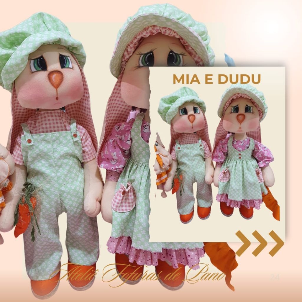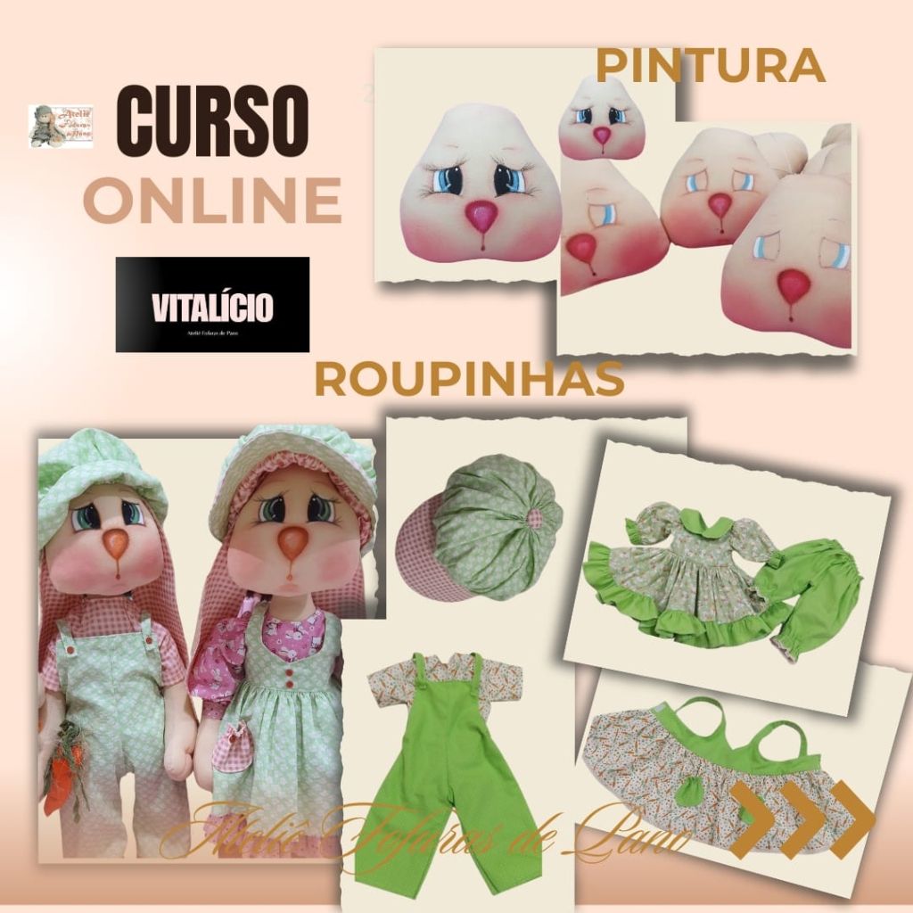 Com o nosso curso online e vitalício, você aprenderá a confeccionar dois casais de coelhos (um grande e um médio), com aulas passo a passo e moldes em PDF super detalhados.