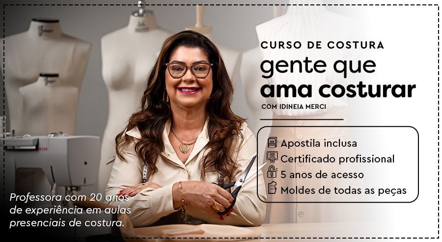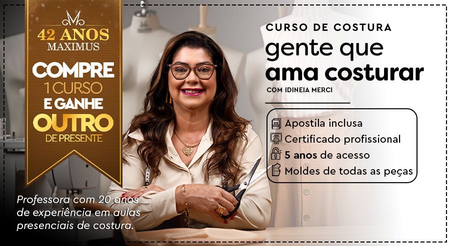 OFERTA EXCLUSIVA: Curso Influenciadora da Costura com a professora Ana Paula Mocelin (De R$ 697,00 por apenas R$ 197,00 à vista). Economize R$ 500,00 à vista comprando junto mais esse curso da Maximus Tecidos. Atenção: Essa oferta estará disponível somente uma única vez nesta página.