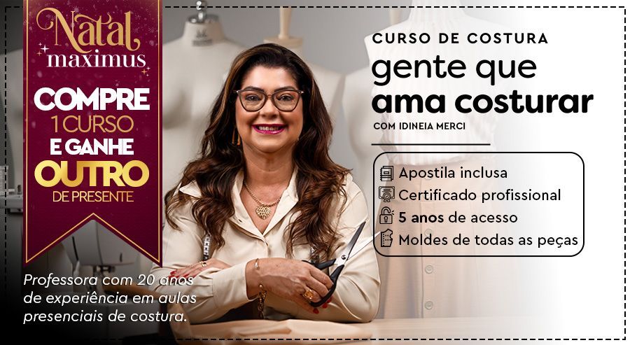 OFERTA EXCLUSIVA: Curso Influenciadora da Costura com a professora Ana Paula Mocelin (De R$ 697,00 por apenas R$ 197,00 à vista). Economize R$ 500,00 à vista comprando junto mais esse curso da Maximus Tecidos. Atenção: Essa oferta estará disponível somente uma única vez nesta página.