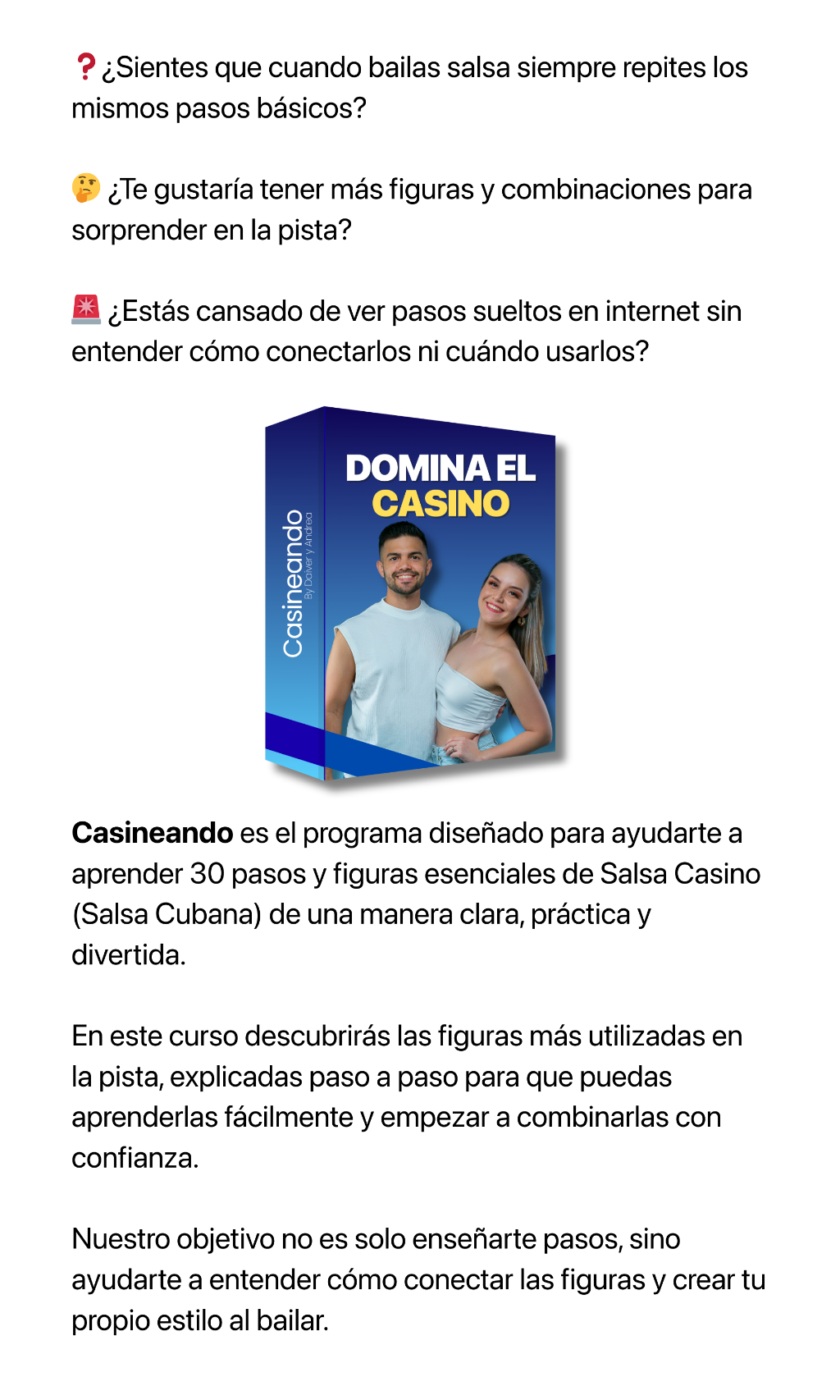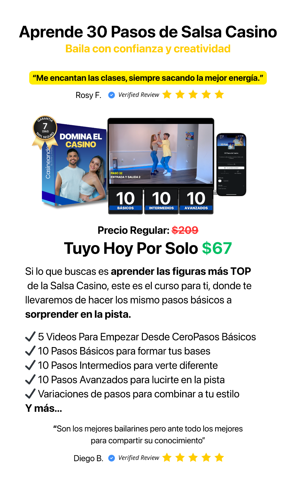 Baila Salsa con seguridad en 30 días sin importar tu nivel. Aquí no sólo aprenderás a bailar salsa, vas a mejorar tu confianza y presencia en la pista para que dejes la inseguridad y bailes individualmente y en pareja, a tu ritmo.