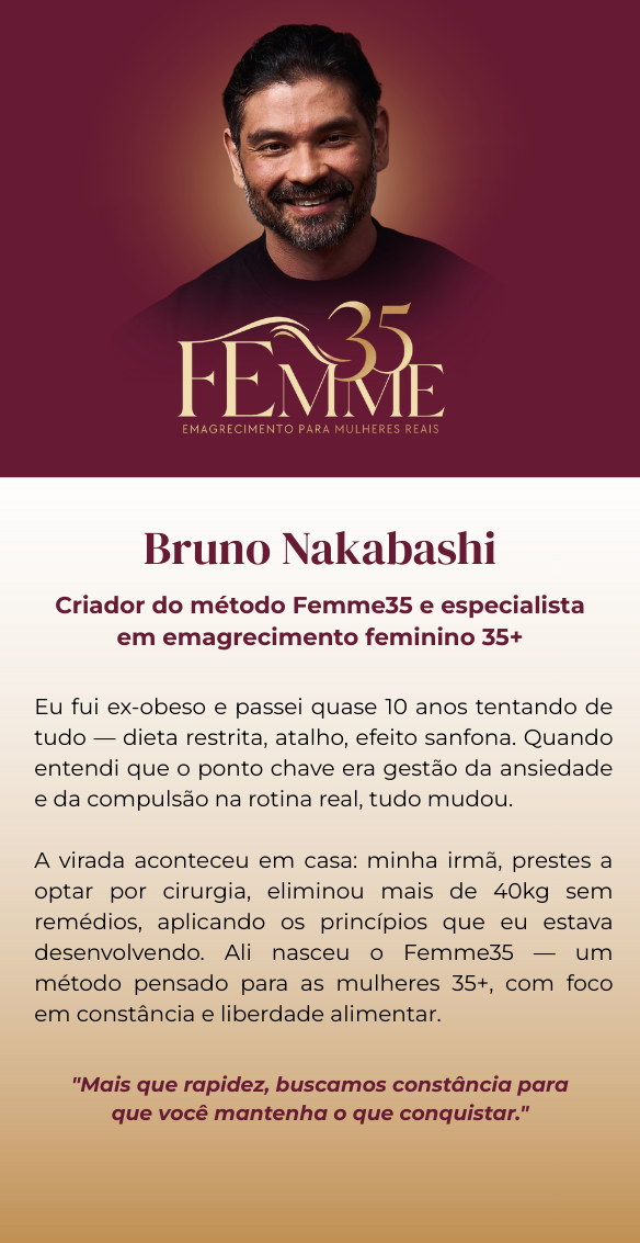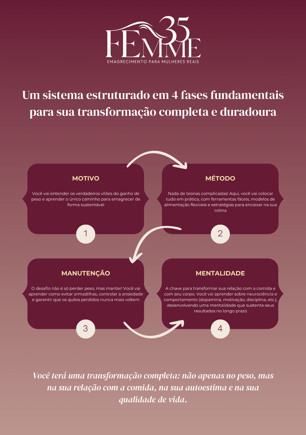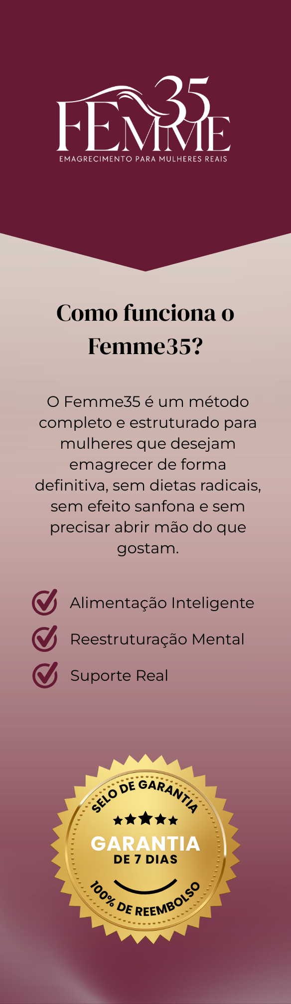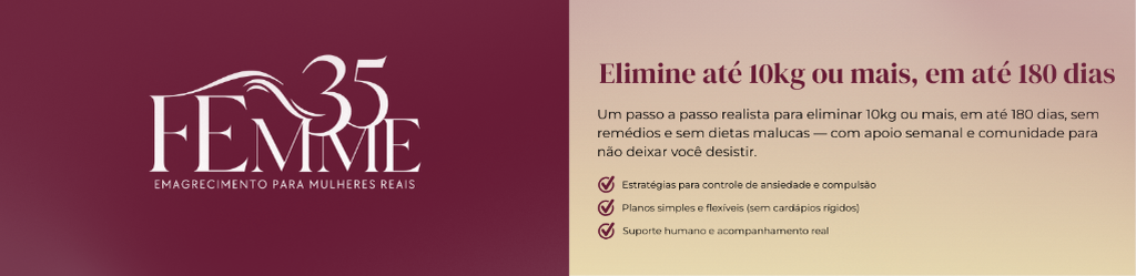 O Manual de Receitas de Emergência Femme35 traz opções rápidas, leves e deliciosas para quando a fome ou a vontade de doce aparecem. São receitas práticas, com ingredientes acessíveis e fáceis de encontrar, que ajudam a manter o foco no emagrecimento sem abrir mão do sabor. Do salgado ao doce, cada preparo foi pensado para trazer equilíbrio, praticidade e prazer à sua rotina.