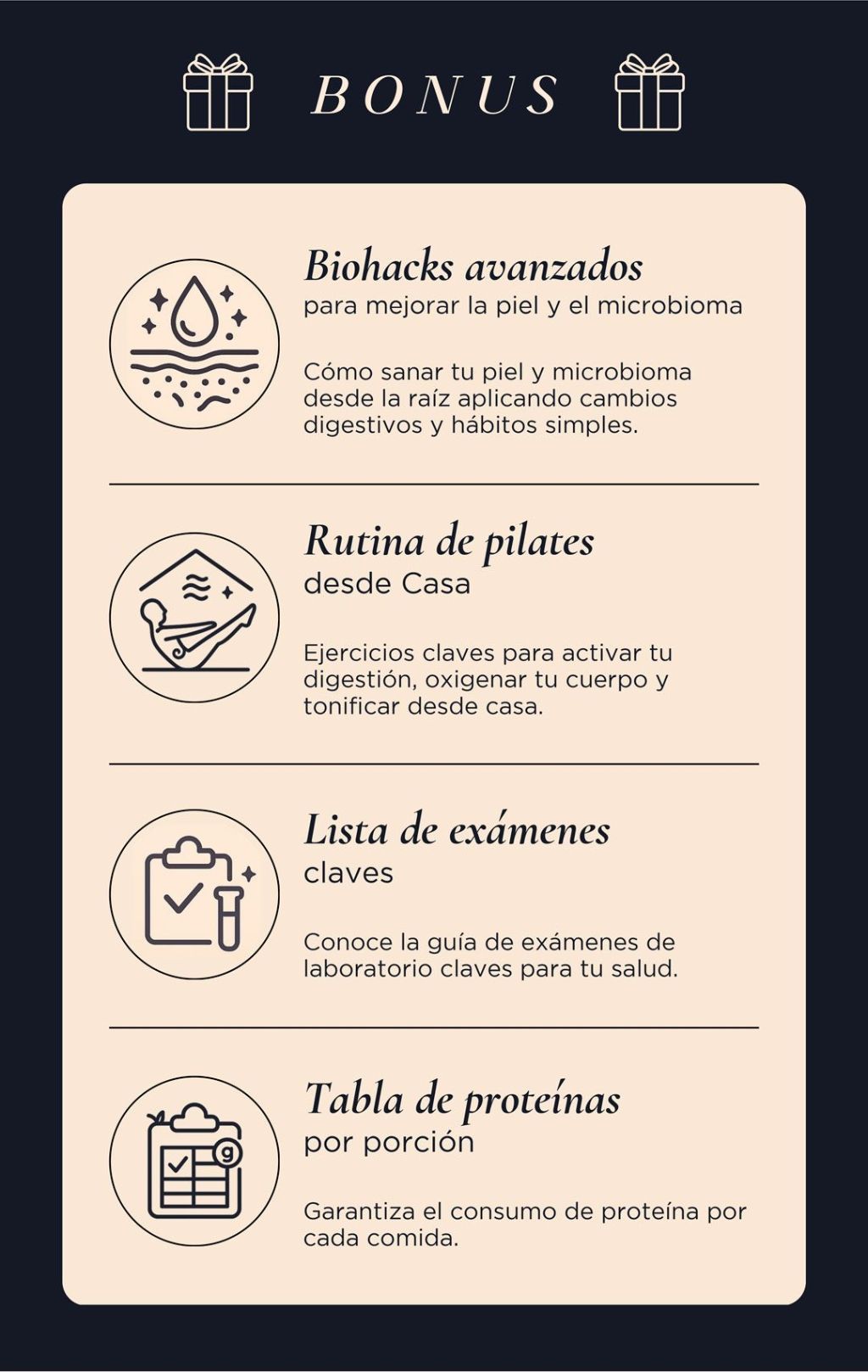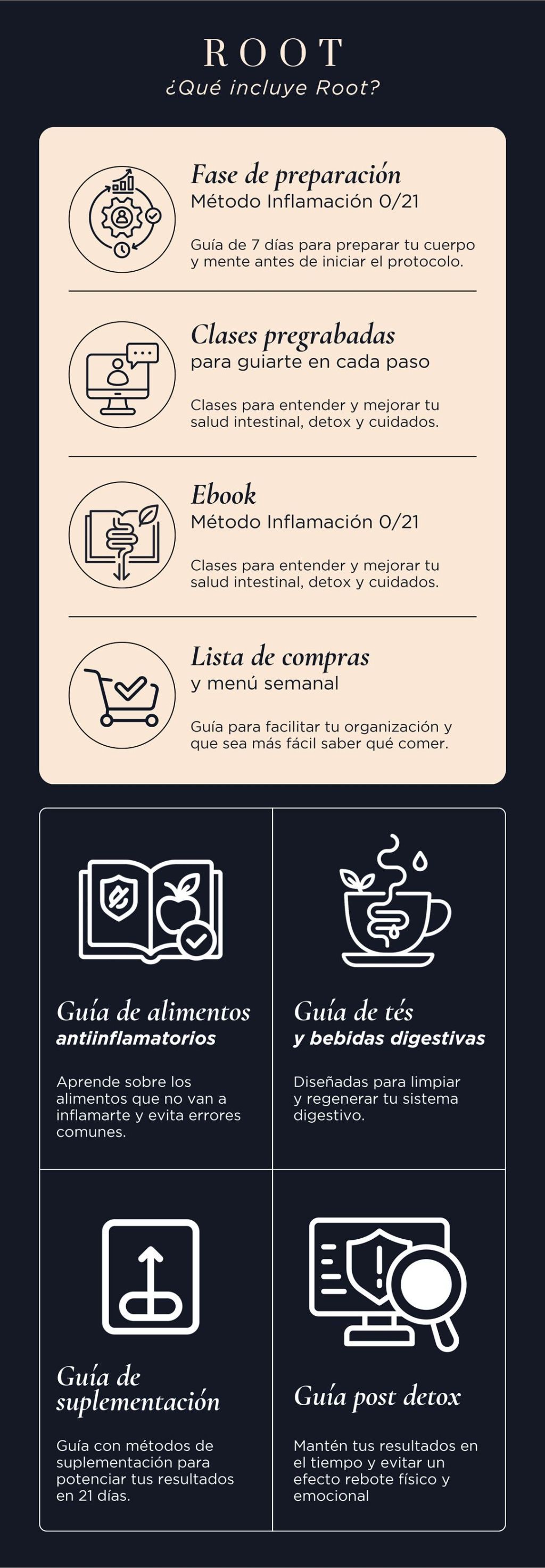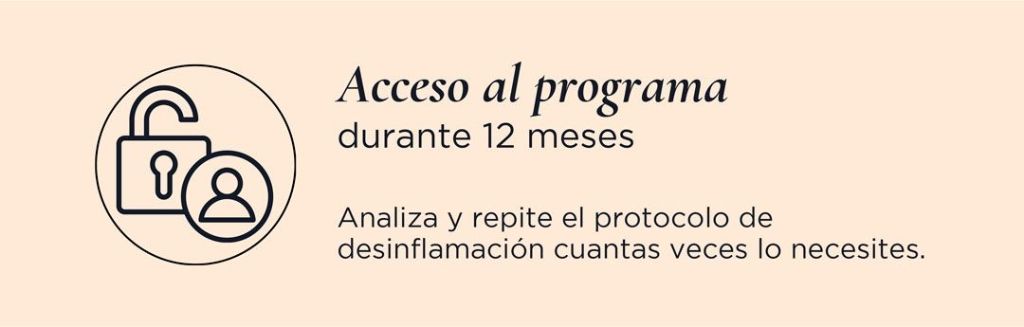Es una guía práctica de 30 días diseñada para acelerar tu proceso de desinflamación. Incluye menús diarios, rituales antiinflamatorios, hacks de energía y seguimiento funcional. Ideal para quienes quieren tener claridad en qué comer, cómo organizar su día y sostener el cambio. Contiene rutinas simples que combinan alimentación, suplementación, respiración y bienestar. Actívalo hoy por tan solo $9 USD