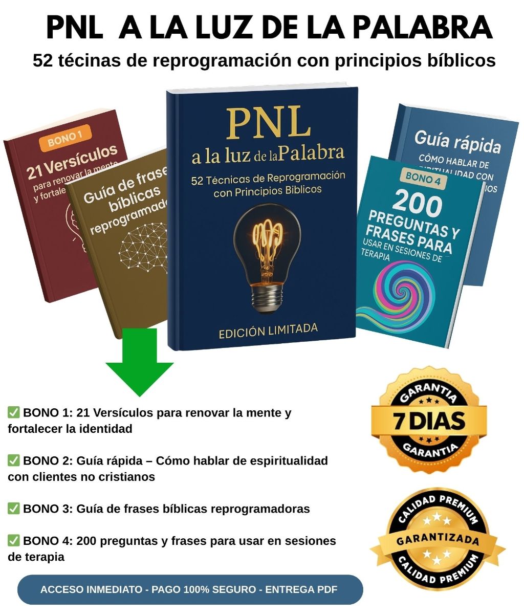 Un mini-pack con 12 herramientas aplicadas de PNL para trabajar situaciones específicas como: ➡️ Duelo con sentido espiritual ➡️ Autoboicot desde la identidad ➡️ Traumas emocionales reprimidos ➡️ Miedo a hablar y mostrarse ➡️ Vicios como mecanismos de defensa ➡️ Insomnio por ansiedad o culpa Todo adaptado a un enfoque terapéutico con valores cristianos. (Esta oferta solo la verás en esta página)