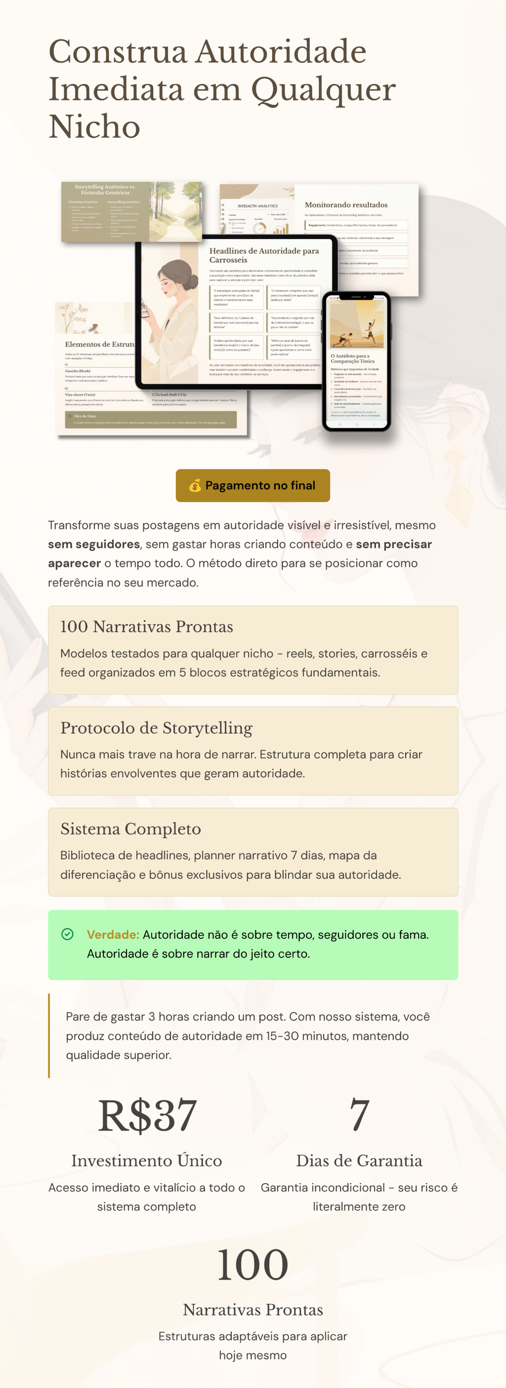 🌱 Histórias pessoais são seu maior ativo de autoridade. Você pode ter o melhor conteúdo técnico do mundo, mas são suas histórias que criam identificação, confiança e magnetismo. 👉 Este caderno reúne 50 modelos de narrativas pessoais para contar experiências de superação, aprendizados, primeiras vezes e valores — tudo de forma estratégica, sem se expor em excesso. Sem ele, sua autoridade pode parecer distante e impessoal. Com ele, você cria conexão profunda que torna sua mensagem impossível d