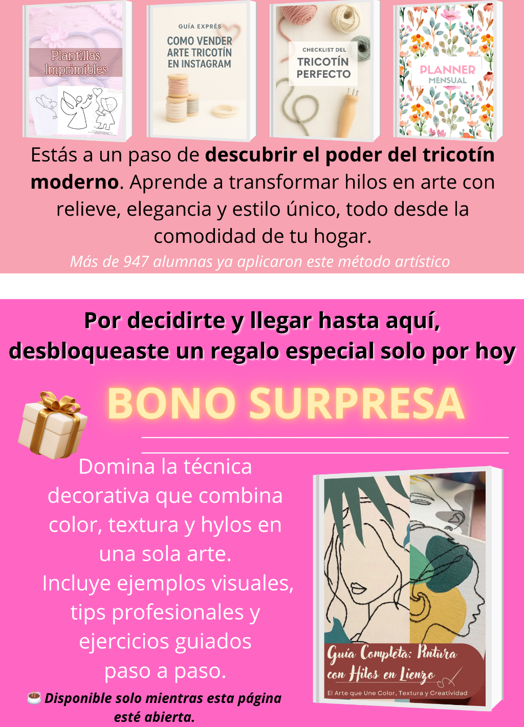 🎁 Añade el toque perfecto a tu compra Guía Hilorama Paso a Paso Descubre una técnica artesanal que combina color, relieve y creatividad pura. Aprende cómo crear cuadros decorativos únicos con hilo y clavos — un complemento ideal para tus diseños en tricotín. ✨ Perfecto para ofrecer piezas personalizadas, combinar técnicas y aumentar tus ingresos. ✅ Instrucciones paso a paso ✅ Diseños fáciles y modernos ✅ Ideal para principiantes y amantes del arte handmade 💡 Llévalo ahora con descuento