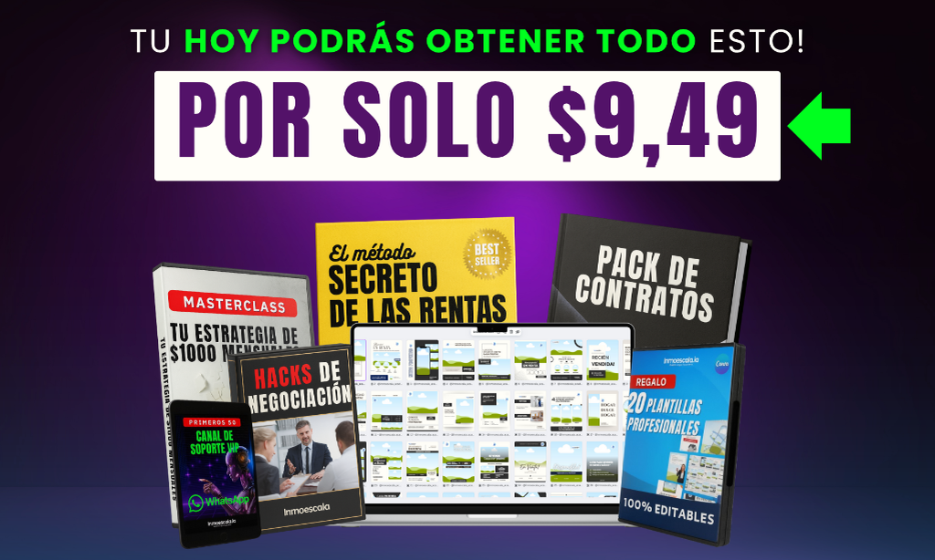 ¡EL PACK TODO EN UNO! ¡Diseñado para escalar tu marca Inmobiliaria, obtendrás +500 plantillas, guías, clips virales y más! (INCLUYE SOPORTE VIP)