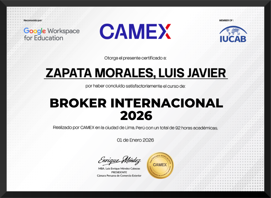 "Docente y Presidente de la Cámara Peruana de Comercio Exterior. Doctorando en Gestión Económica Global y MBA Internacional, Agente de Aduanas con más de 20 años de experiencia."