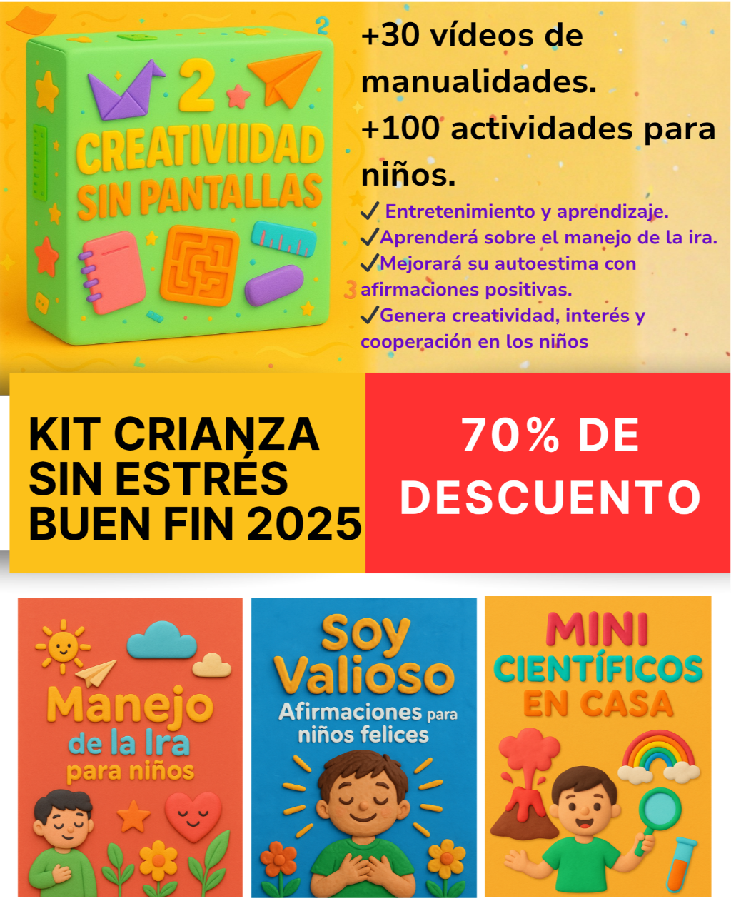 KIT CRIANZA SIN ESTRÉS - Creatividad sin pantallas. + Ebook Me Calmo y Respiro + Ebook Manejo de la ira para niños