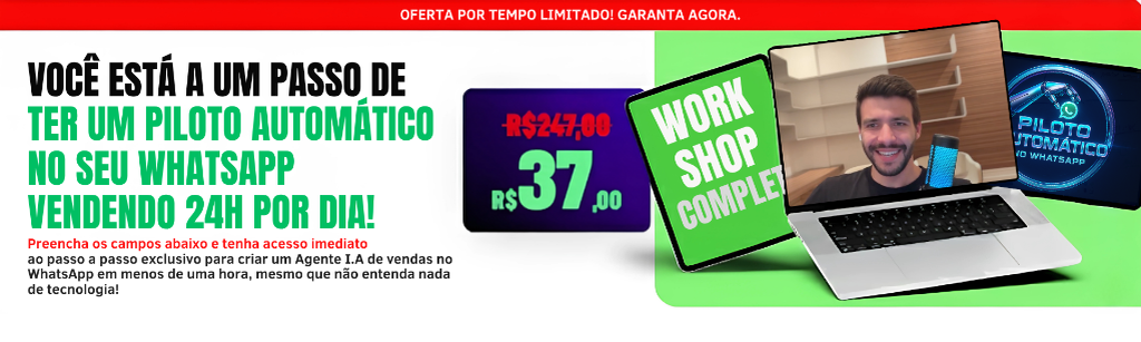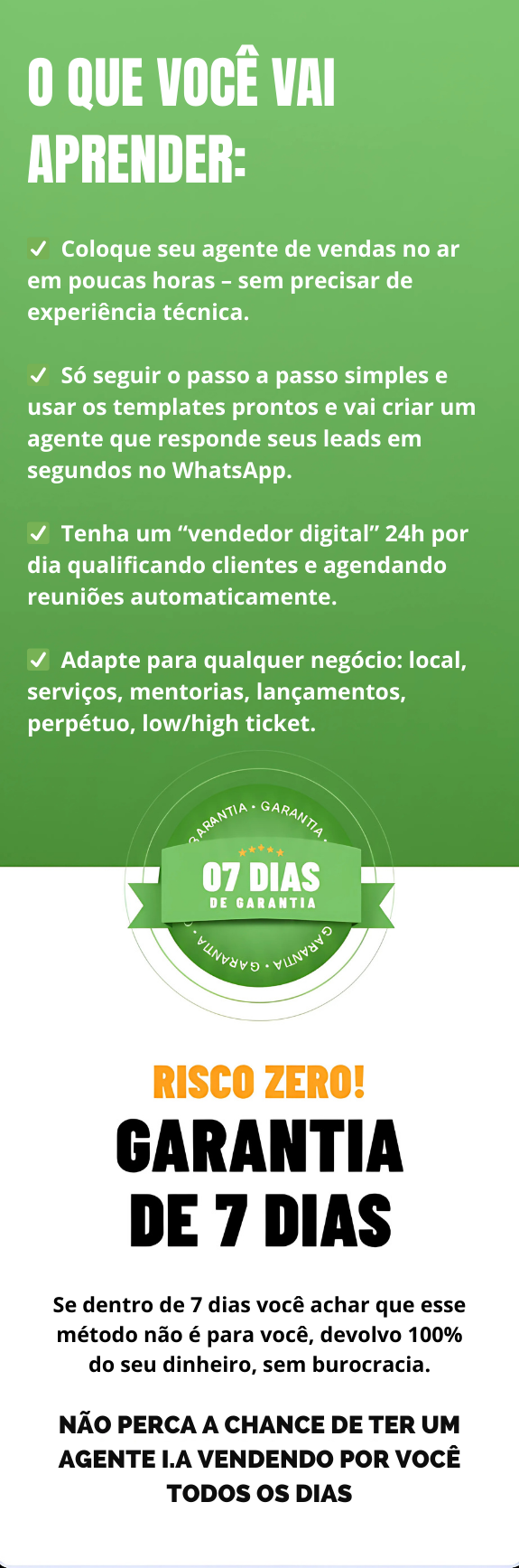 O guia essencial para implementar com segurança, evitar erros críticos e colocar no ar em 24 horas. Com este Checklist, você vai conseguir: ✅ Como configurar seu agente sem travar em nenhuma etapa técnica. ✅ O que não pode faltar nos treinamentos para ele responder corretamente. ✅ Elementos críticos que sabotam a qualificação de leads. ✅ A ordem correta de testes antes de ativar para o público. Esse checklist nunca esteve a venda, essa é uma opotunidade única.