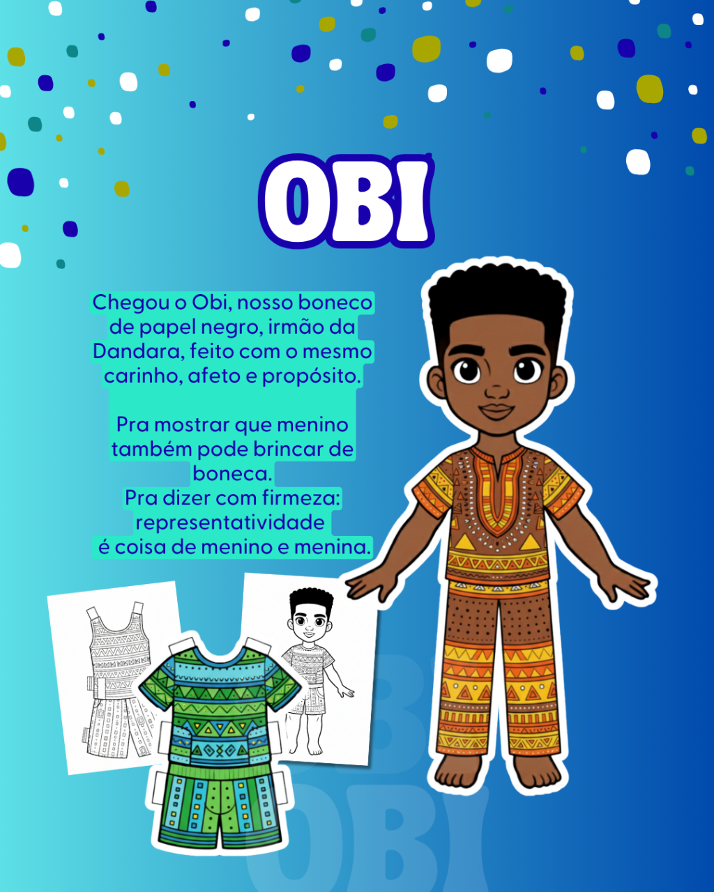 🎁 Leve também a Dandara, a boneca de papel que já emocionou centenas de famílias! 👧🏾✨ Ideal para brincar junto com o Obi, são irmãos de papel que fortalecem identidade, autoestima e afeto desde a infância. ✅ Versão colorida e para colorir ✅ 13 roupinhas diferentes ✅ Imprima e brinque quantas vezes quiser 💛 Adicione agora com valor especial e tenha o par completo para criar memórias que atravessam gerações.