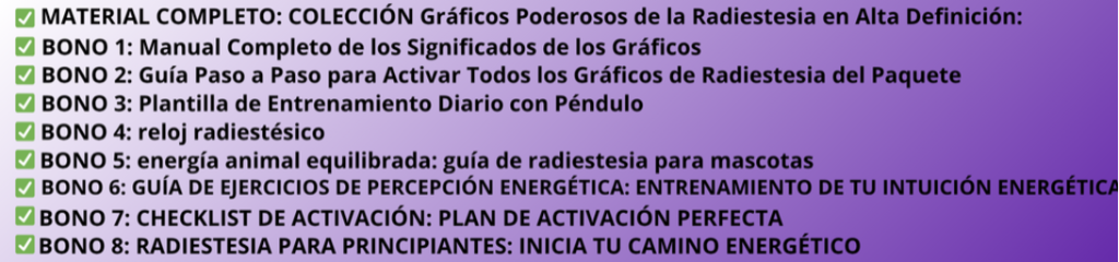 ✅ Acceso vitalicio + Actualizaciones mensuales ✅ Pack Básico de Geometrías Sagradas ✅ Pack de Armonización y Bienestar Energético ✅ Pack de Diagnóstico / Investigación ✅ Pack de Protección y Limpieza ✅ Protección Energética ✅ Pack de Rituales para la Abundancia y la Prosperidad ✅ Las mesas de Radiestesia más solicitadas ✅ Mandala Radiónica para la PROSPERIDAD ✅ Protección Energética del Hogar ✅ Pack Maestro / Completo
