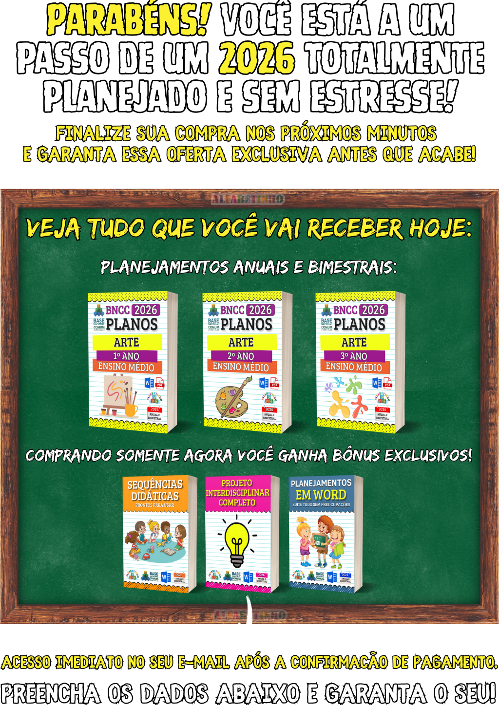 400 Atividades e 560 Planejamentos, todos organizados por Ano e Bimestre, de acordo com a BNCC 2026. perfeitas para uso imediato. 🎁 GANHE BÔNUS EXCLUSIVOS: 1️⃣ PLANEJAMENTOS EM WORD 2️⃣ ATIVIDADES EM WORD 3️⃣ GABARITOS DAS ATIVIDADES 4️⃣ 32 PLANOS DIÁRIOS 5️⃣ 24 PLANOS SEMANAIS 6️⃣ 16 PLANOS MENSAIS 😱 DESCONTO IMPERDÍVEL, APENAS AGORA!