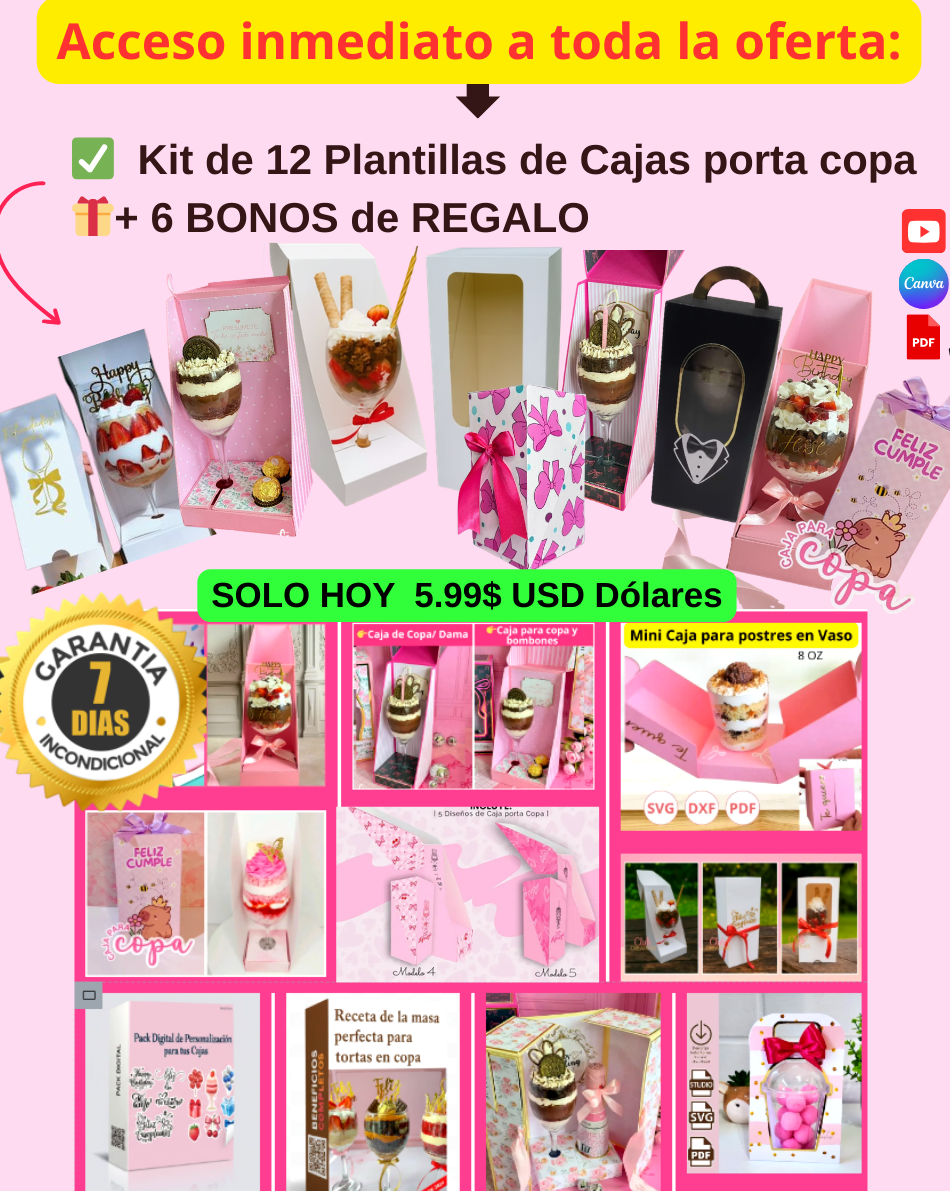 🎁Kit Plantillas editables para cajas de copa de postres y tortas🍸