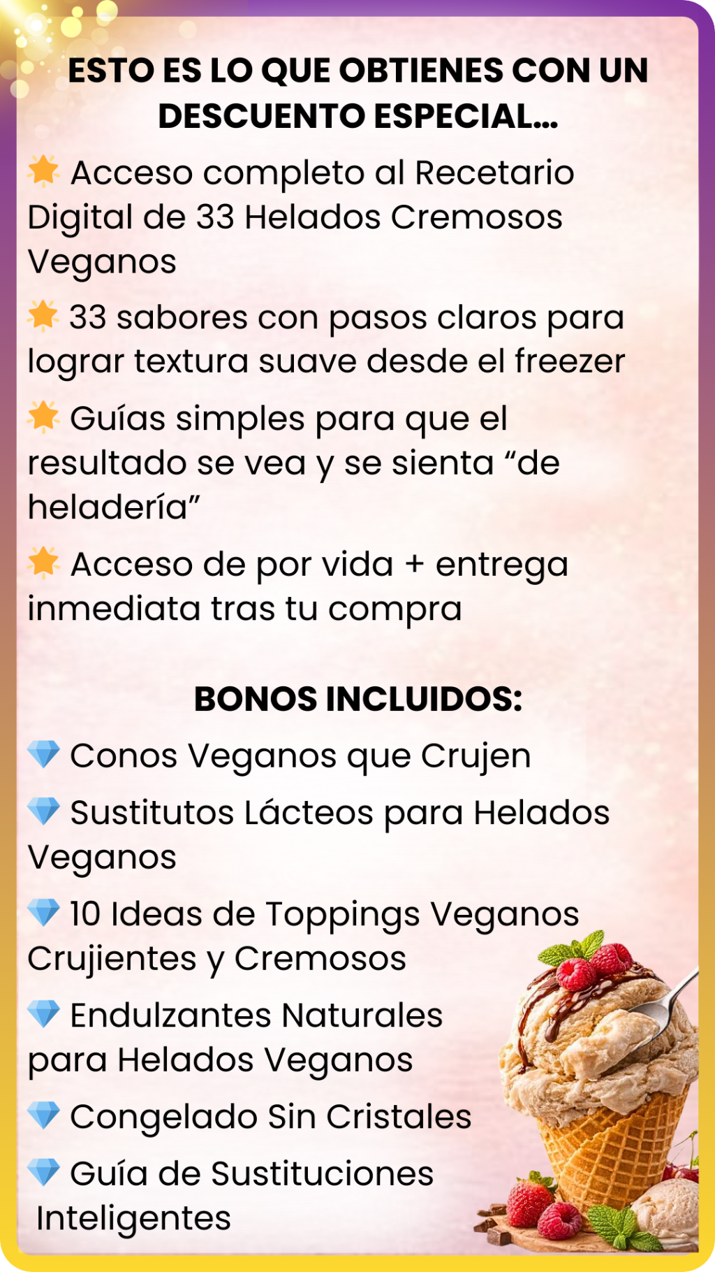 Un helado cremoso es delicioso… pero cuando lo acompañas con el postre perfecto, se convierte en un momento especial 🍨✨ Este recetario incluye 40 postres veganos, sin lácteos ni huevo, pensados para disfrutar en casa: 🍪 Galletas que combinan perfecto con helado 🍰 Bizcochos esponjosos 💛 Perfectos para crear momentos especiales en familia ☕ Disfrutar ese gustito dulce sin culpa 👉 El 98% de nuestros clientes descargan este ebook con su compra.
