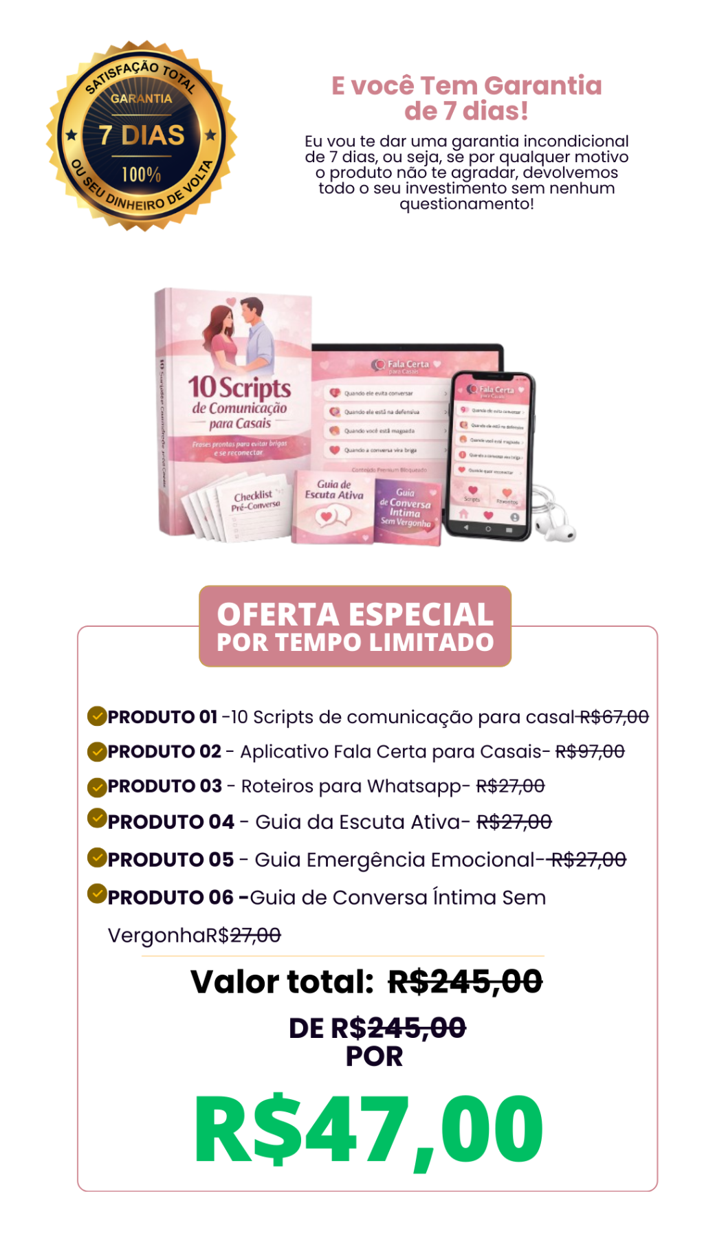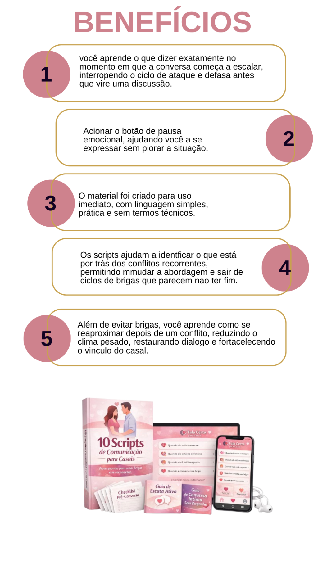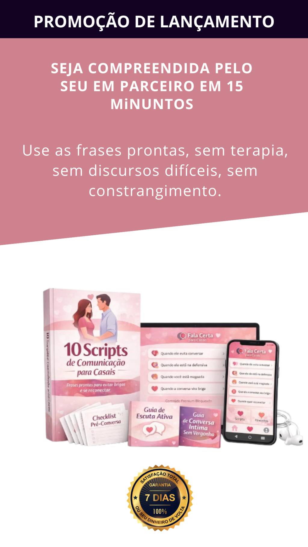 Tenha em mãos um guia rápido e prático para saber exatamente como conduzir uma conversa importante no relacionamento. Este Checklist de Comunicação Eficaz mostra os passos simples que ajudam você a falar com mais clareza, evitar conflitos desnecessários e aumentar as chances de ser compreendida pelo seu parceiro. Antes de iniciar uma conversa delicada, basta consultar este checklist e verificar se você está aplicando os princípios que tornam o diálogo mais saudável e produtivo.