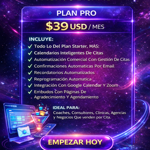 Plan diseñado para emprendedores y negocios que desean automatizar su presencia digital, gestionar citas con clientes y organizar su proceso comercial desde una sola plataforma. Incluye herramientas para crear páginas web, capturar prospectos,