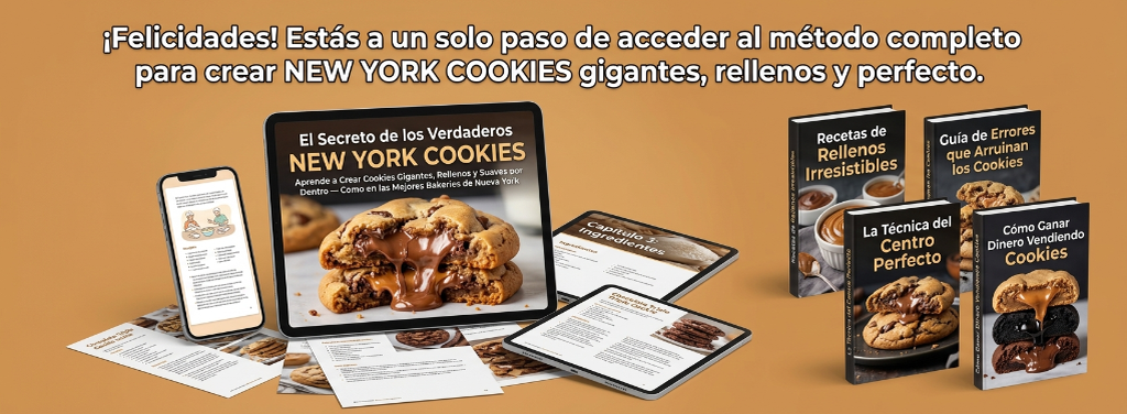 Llévate los 4 eBooks anteriores + 1 bono extra: Cajas y Empaques que Venden New York Cookies. Descubre cómo transformar tus cookies en productos irresistibles que parecen de bakery profesional. Aprende qué cajas usar, cómo presentar tus New York Cookies para regalo y qué detalles simples pueden hacer que tus clientes perciban más valor y paguen precios más altos por tus cookies. Convierte cada pedido en una experiencia premium que prácticamente se vende sola.