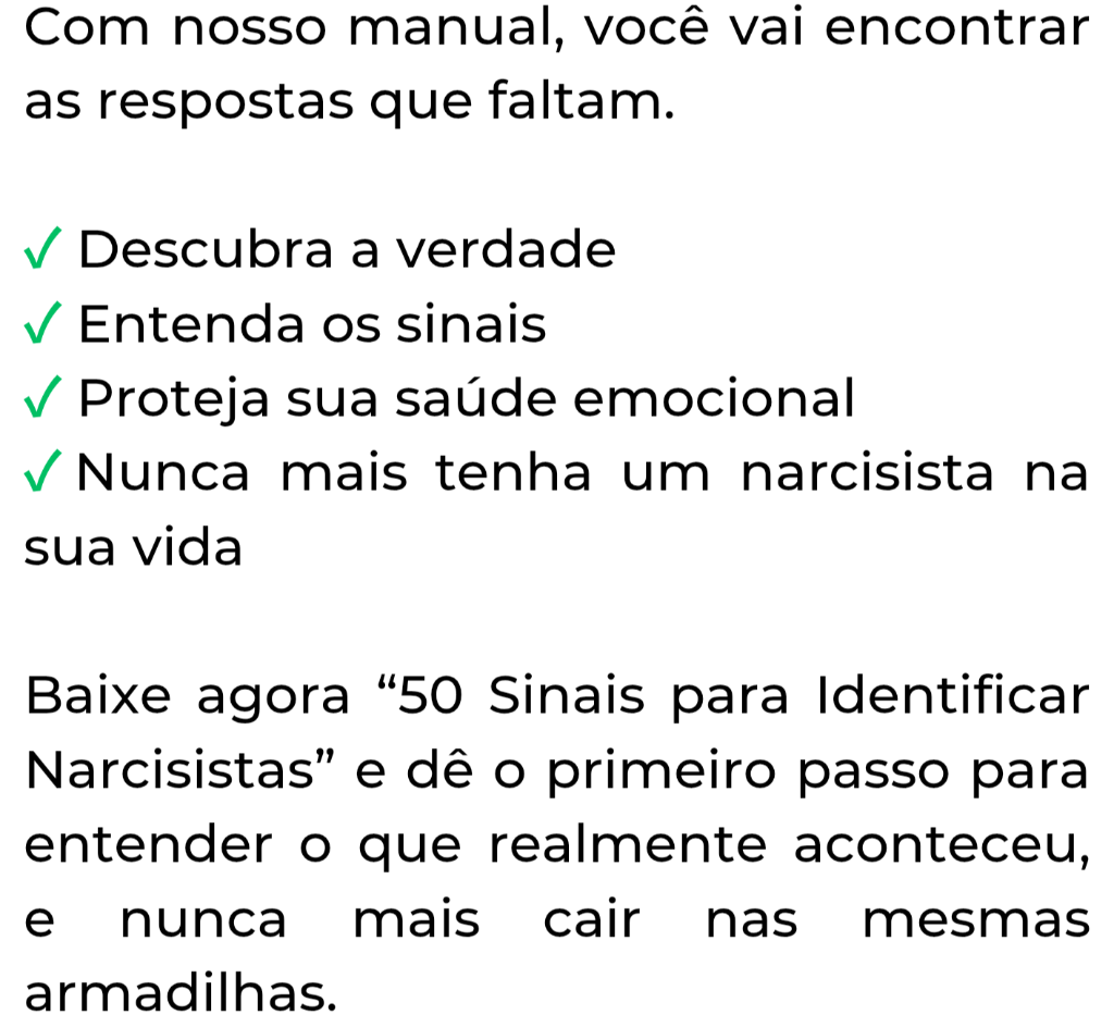 Receba agora um guia exclusivo sobre o método da pedra cinza e aprenda como afastar um narcisista da sua vida de forma eficaz e segura. Este método te ajudará a se blindar enquanto você ainda precisa conviver com o narcisista. É uma forma de retomar seu poder, se libertar do ciclo tóxico que ele te colocou e evitar que ele tenha interesse em voltar. Geralmente, ele custa R$ 34,90, mas se você levá-lo em conjunto, sairá por apenas R$ 8,90. Marque a opção e aproveite!