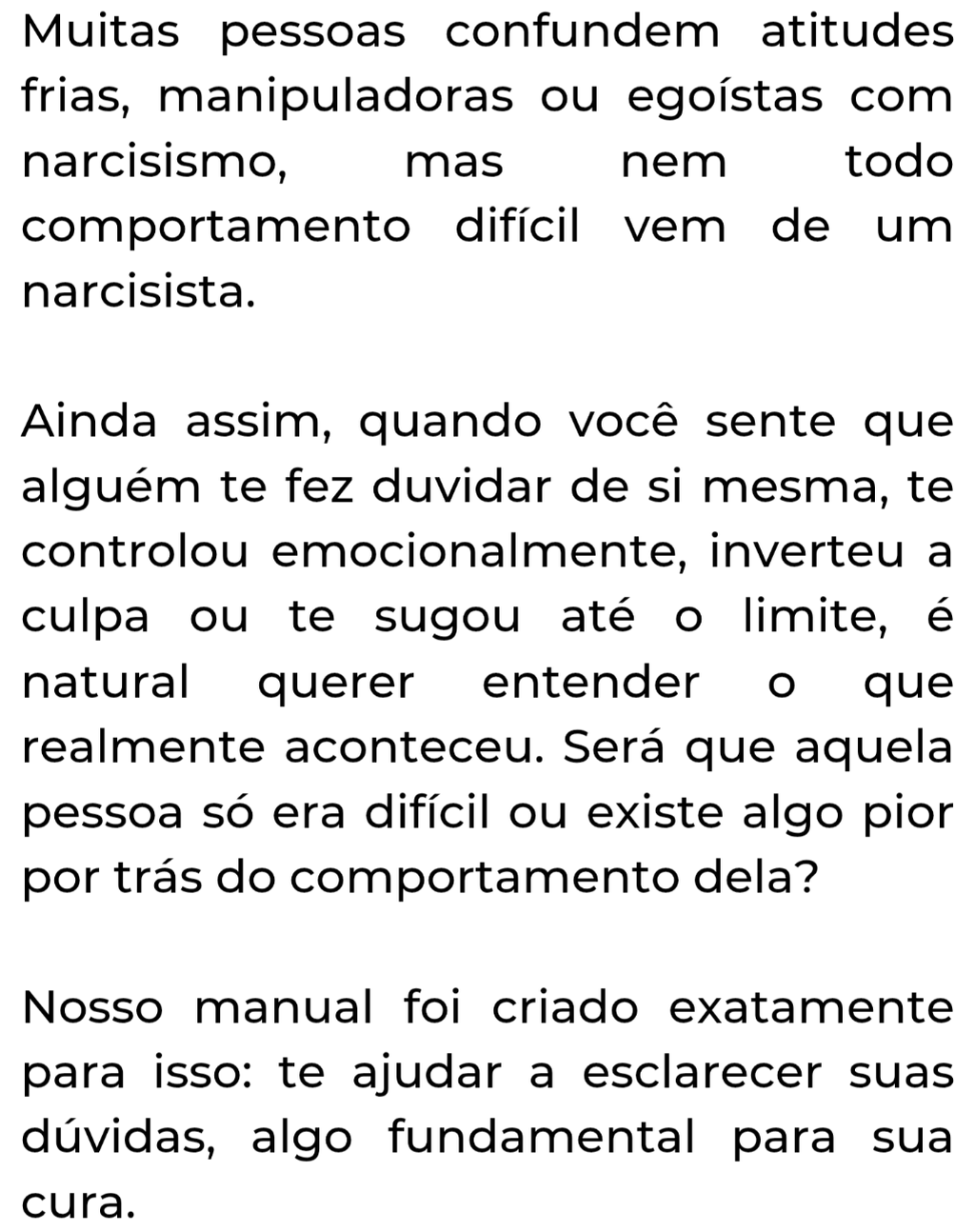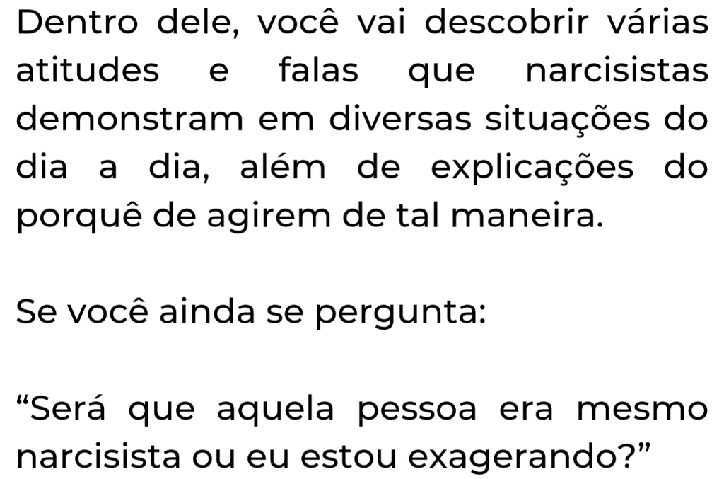 Receba agora um guia complementar e FUNDAMENTAL para você seguir sua vida após romper com o narcisista. Você já se perguntou como voltar a ser feliz? Como reconstruir sua vida? Como vencer a codependência? Este guia vai te ajudar a CONTINUAR FIRME, VIRAR A PÁGINA e FAZER SEU BRILHO VOLTAR, para que você possa escrever seu novo capítulo de vida. Normalmente, este guia custa R$ 34,90, mas se você garantir em conjunto, você pode levá-lo por apenas R$ 8,90! Marque a opção e aproveite!