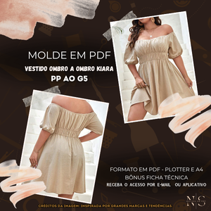 NS Molde em PDF - Vestido Ombro a Ombro Kiara (Vestido Estilo Casual Busto Plissado Ombro à Ombro Manga Bufante Cintura Alta)