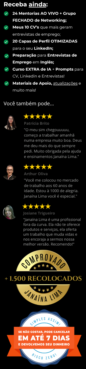 💎 [Super Pacote VIP] Mentorias AO VIVO 2x por mês + Grupo SECRETO de Networking + Programa VIP de Recolocação + Método Vença a Procrastinação + Bônus Aceleradores de Emprego e Carreira!