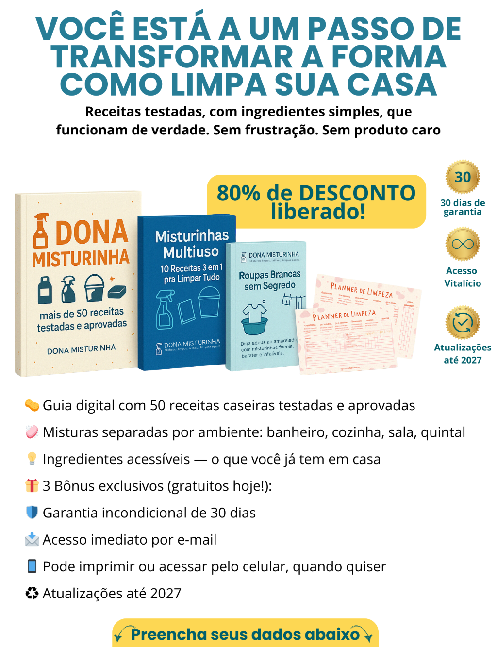 Você limpou com a Dona Misturinha… agora é hora de organizar como uma profissional! Receba os segredos das organizers para manter tudo no lugar, com truques simples que transformam sua casa. Organização por ambiente, checklists e dicas que fazem a diferença. ✨ O complemento ideal pra sua casa ficar limpa, cheirosa e impecável. Adicione agora!