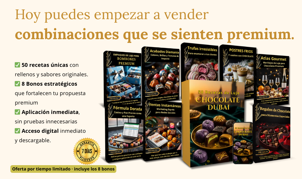 💡 Estos bombones son tendencia en Instagram, TikTok y WhatsApp. Su diseño y sabor generan tanta demanda que se piden todos los días. ✅ Aprovecha la viralidad que ya existe: solo necesitas replicarlos y ofrecerlos en tus redes, porque los clientes ya los reconocen y los quieren comprar. ✨ Con estas recetas te subes a una ola que está de moda y que sigue creciendo. ⚡ Disponible únicamente en este checkout.