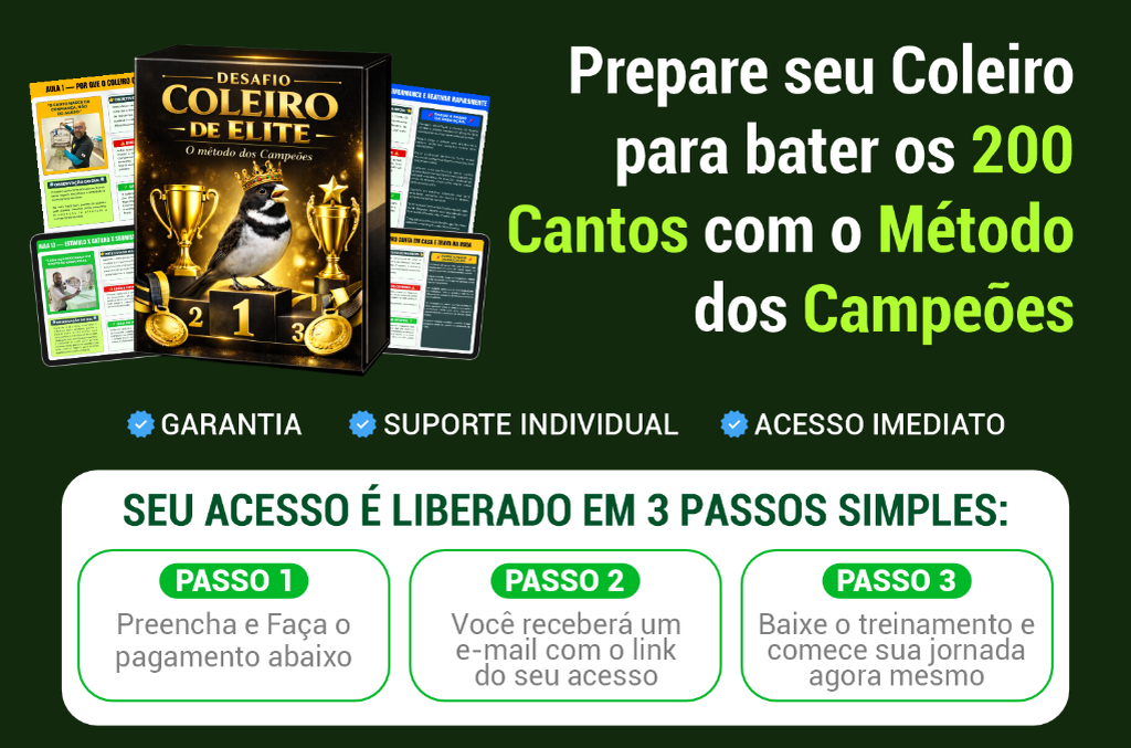 Pare de mexer no escuro! Aprenda o passo a passo que os campeões usam pra acertar o ponto do coleiro com precisão, sem exagero e sem travar. Domine o nosso Método e veja seu passarinho cantar firme e constante nas rodas, com controle total e confiança em cada mexida.