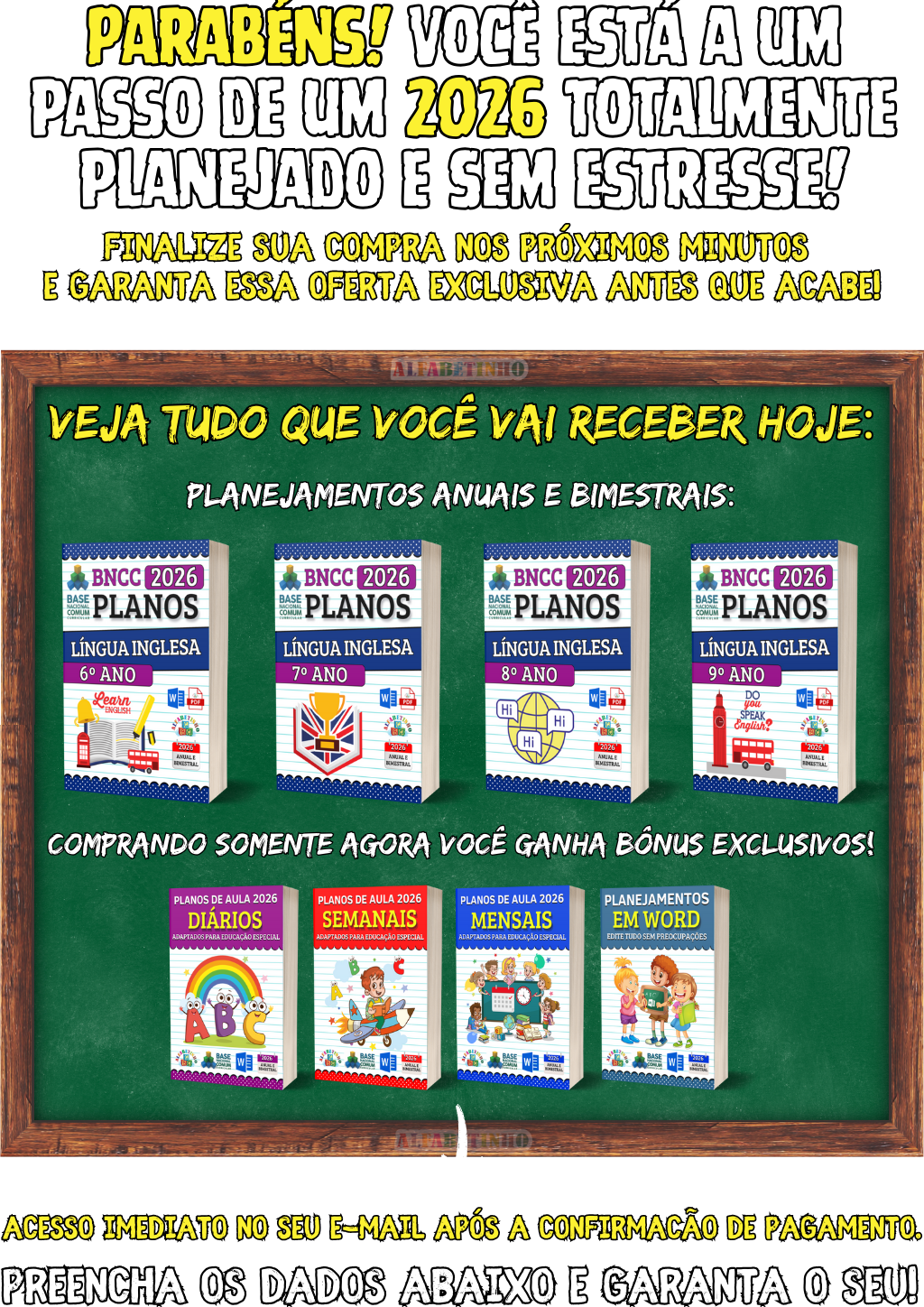 400 Atividades, todas organizadas por Ano e Bimestre, de acordo com a BNCC 2026. perfeitas para uso imediato. 🎁 GANHE BÔNUS EXCLUSIVOS: 1️⃣ ATIVIDADES EM WORD 2️⃣ GABARITOS DAS ATIVIDADES 3️⃣ 32 PLANOS DIÁRIOS 4️⃣ 24 PLANOS SEMANAIS 5️⃣ 16 PLANOS MENSAIS 😱 DESCONTO IMPERDÍVEL, APENAS AGORA!