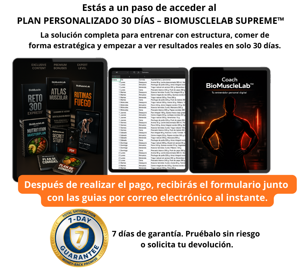 Si tu objetivo es una transformación real en 90 días, este es el paso lógico. BioMuscleLab 2.0 es el sistema completo que te guía semana a semana con estructura, progresión y enfoque estratégico para cambiar tu físico de forma sostenida. Deja de improvisar y sigue un método probado, diseñado para llevar tus resultados mucho más lejos que un plan corto.