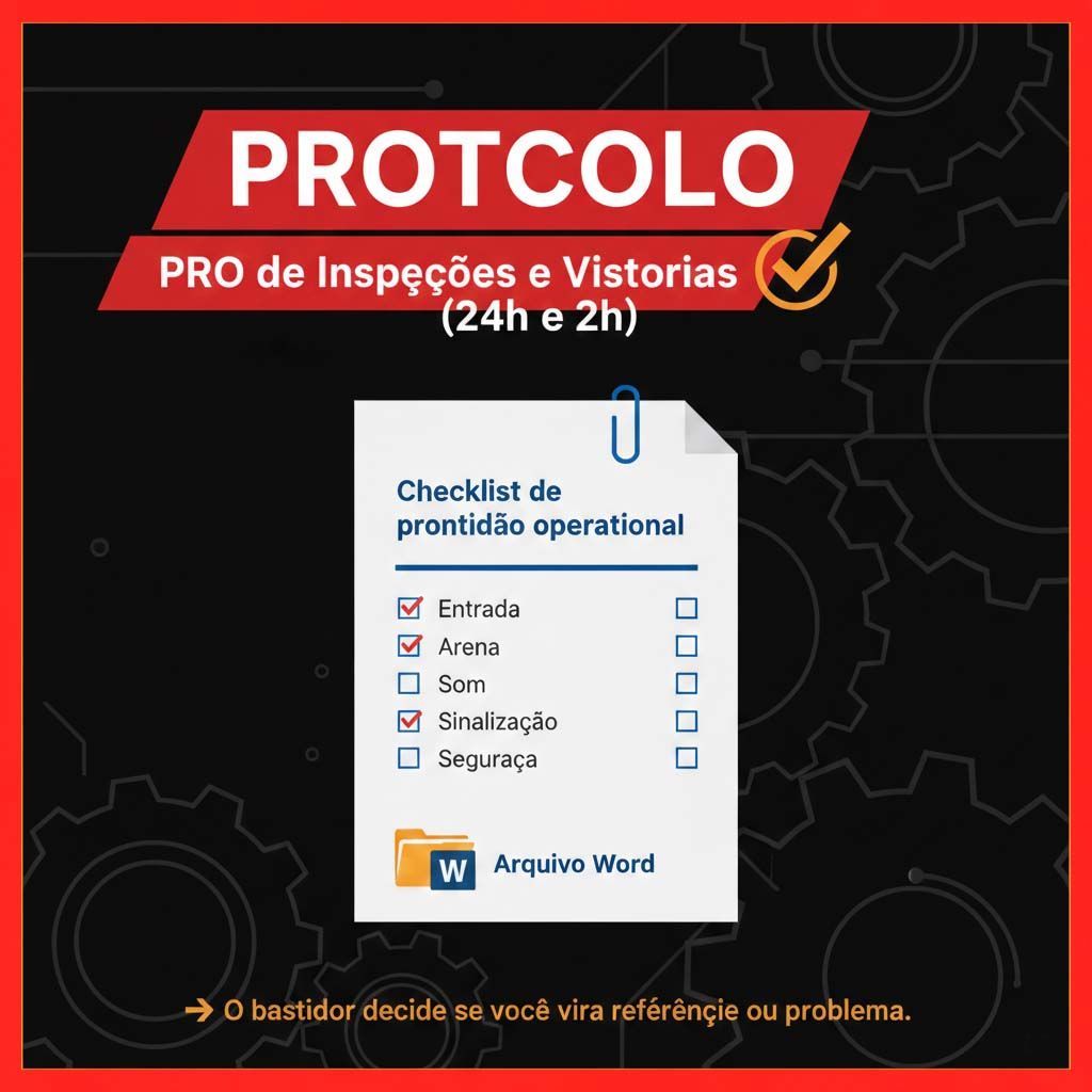 Padronização: Pare de confiar na memória da sua equipe. Tenha um processo replicável.Segurança Jurídica e Operacional: Documente que cada item crítico foi vistoriado e aprovado.Autoridade: Mostre para seus clientes e parceiros que o seu bastidor opera com nível de excelência profissional.Agilidade: Receba em arquivo Word e adapte para qualquer tamanho de evento em minutos."A diferença entre um amador e um profissional é que o profissional tem um método para quando as coisas dão errado. O mestre tem um protocolo para garantir que tudo dê certo."Pronto para elevar o nível do seu bastidor?