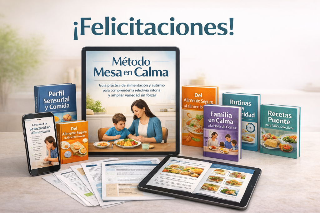 Mega Pack de Apoyo Práctico para la Hora de Comer reúne 4 recursos clave para aplicar el proceso alimentario con más estructura, seguimiento y claridad: menús visuales, diario de progreso, guía de loncheras y tarjetas de exploración sensorial. Además, incluye Protocolo de Crisis en la Mesa como bono especial para actuar con más calma en momentos difíciles. Una solución práctica y completa para familias y profesionales que buscan herramientas reales para el día a día.