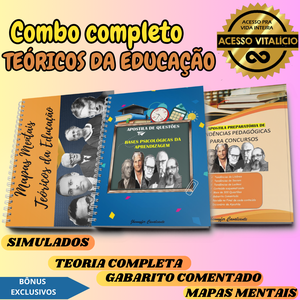 Teoria Completa de Conhecimentos Pedagógicos, simulados com questões de provas e gabariro comentado.