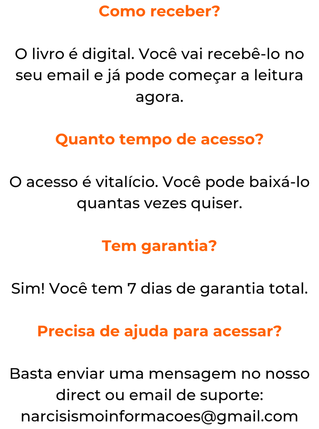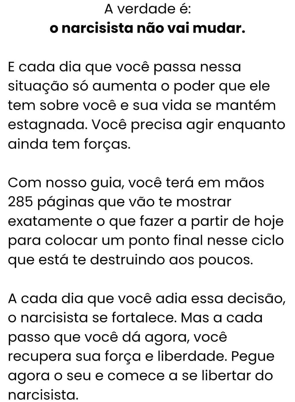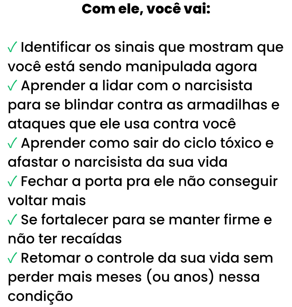 NUNCA MAIS CORRA O RISCO DE TER UM NARCISISTA NA SUA VIDA! Receba agora um manual exclusivo com 208 páginas que vão te revelar 50 sinais pra você identificar narcisistas em RELACIONAMENTOS, AMIZADE, FAMÍLIA e TRABALHO, te mostrando 50 coisas que narcisistas FAZEM E FALAM em diversas situações, juntamente com a explicação dos MOTIVOS que geram essas atitudes. Normalmente, este guia custa R$ 30,00, mas se você garantir em conjunto, você pode levá-lo por apenas R$ 8,90! Marque a opção e aproveite!